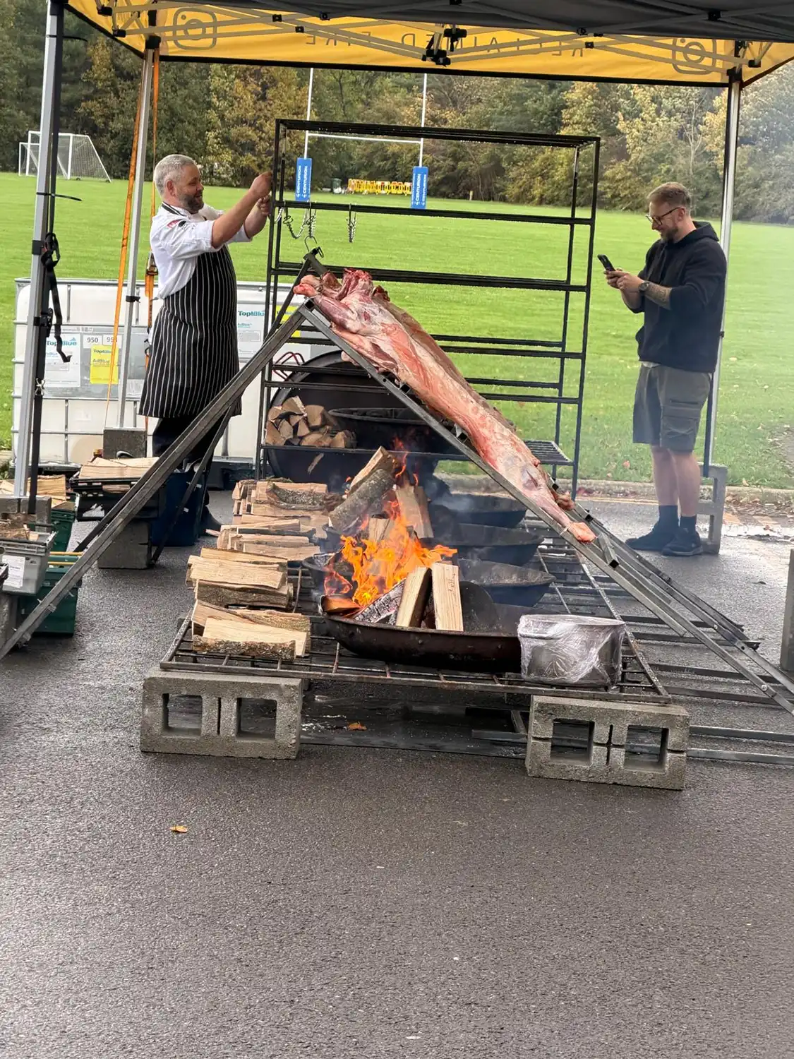 We bought extra cinder blocks and an extra event shelter & racket strapped the event shelter to the heavy cinder blocks. This gave the fire cage and the 4 lamb frames cover from the rain. The wind tested the plan to its limit but the plan held strong and we were able to cook! With the rain persisting it was important we kept the wood dry so we resorted to carrying the wood in batches from the van rather than storing it close to the fires. This was a long but necessary process. The wind was blowing all the heat away from the meat so we had to position the meat closer the normal to the fire. These were all great learning points and we are confident now we can still produce exceptional food and incredible theatre in the worst of weather.